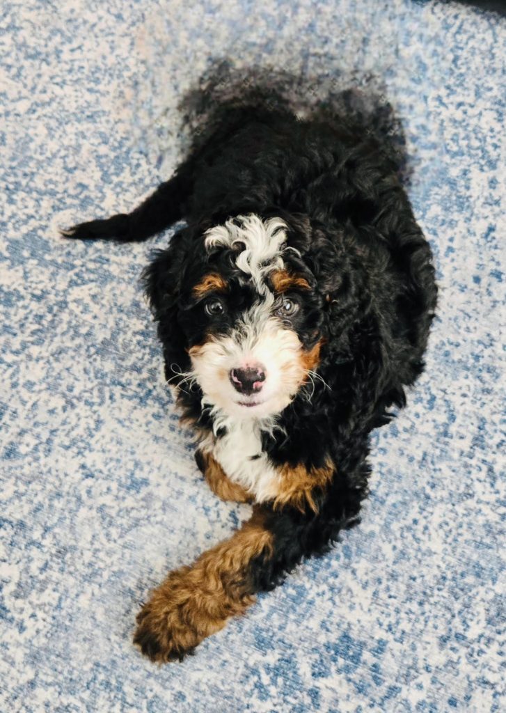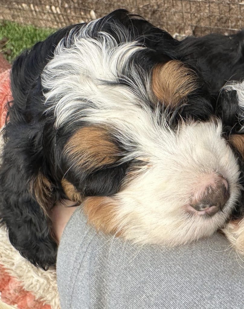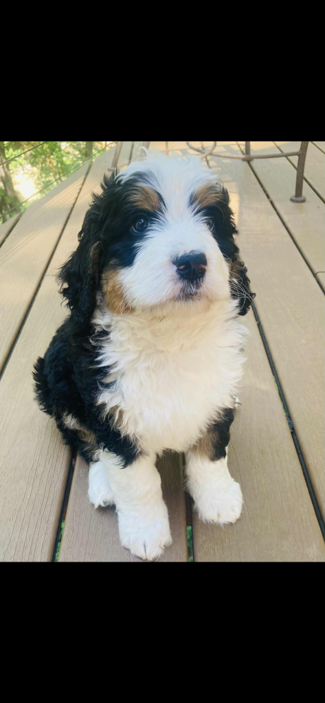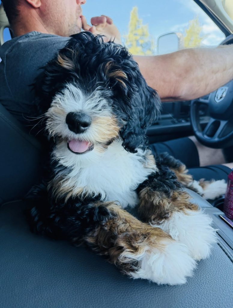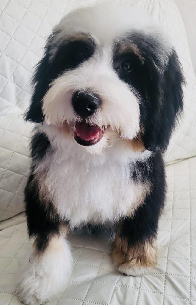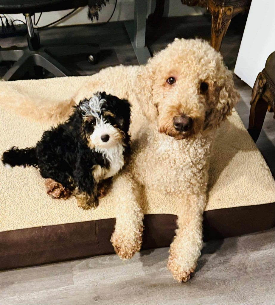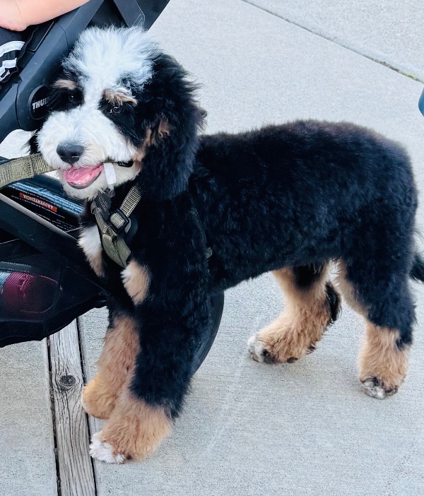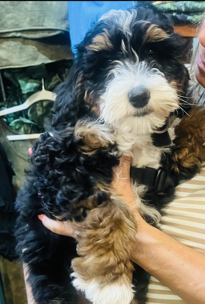 We may be Biased but we feel he is the best looking Bernedoodle we have ever seen. This may also be WHY he is so popular with the ladies! He is the father to all the pups we offer. He is a Velcro dog, as in always wants to be by your side or in your lap. Jackie is Genetically health tested and weighs 30lbs