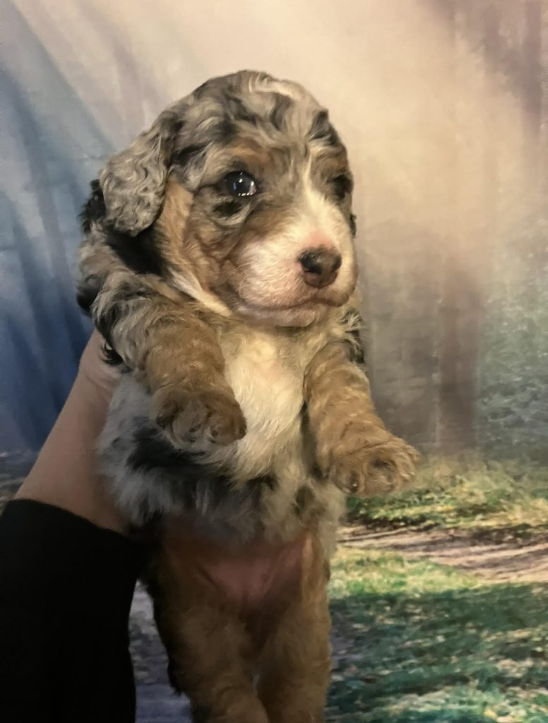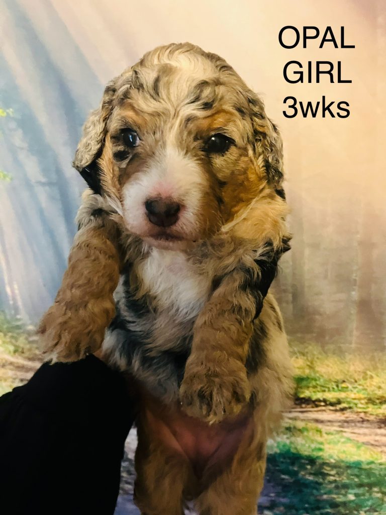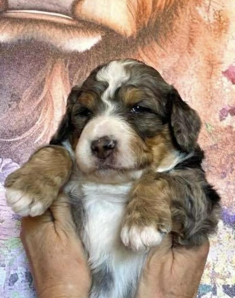 Pearl the Merle is a sweet gentle mama who has beautiful Merle markings. She is a bit of a house horse but her boyfriend Brutus is only 20lbs. So their pups are a wonderful standard size. Their pups are what we call top shelf, Bernedoodles. Strikingly, beautiful traditional tri color, rare Merle and even some rare Red Bernedoodles. The pups temperaments are Devine! (PS Brutus wanted us to mention that their honeymoons are natural, as in no insemination. When you consider the size difference, Brutus deserves some kind of a trophy! )