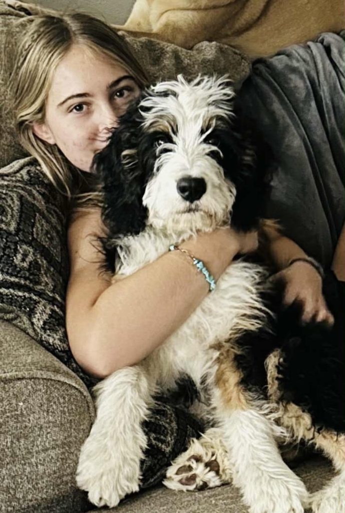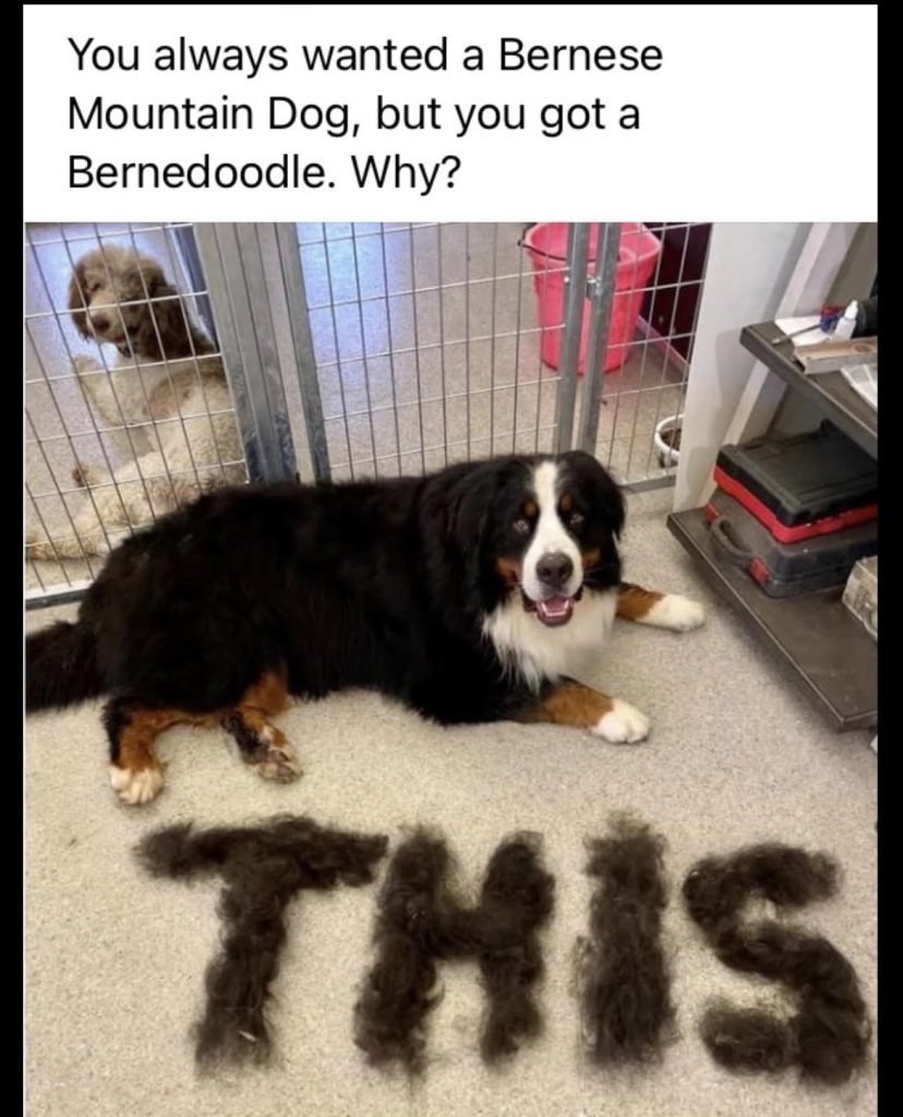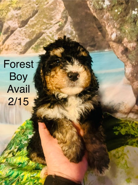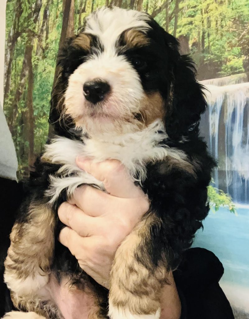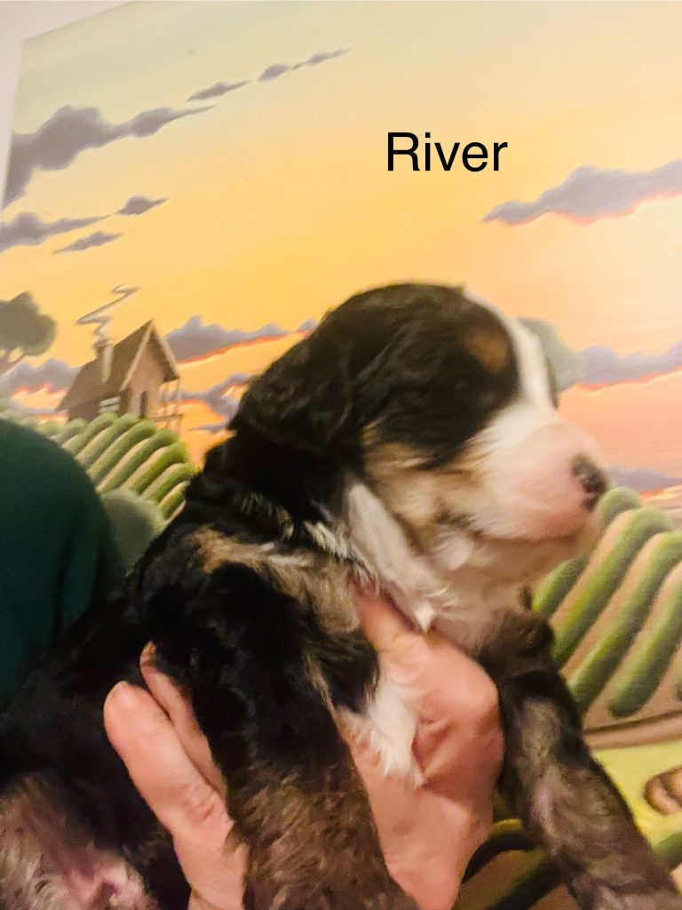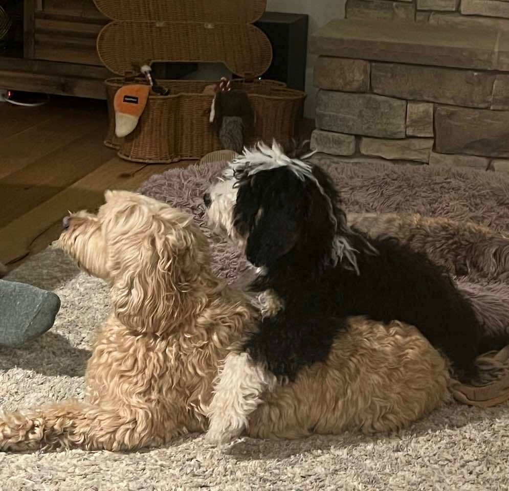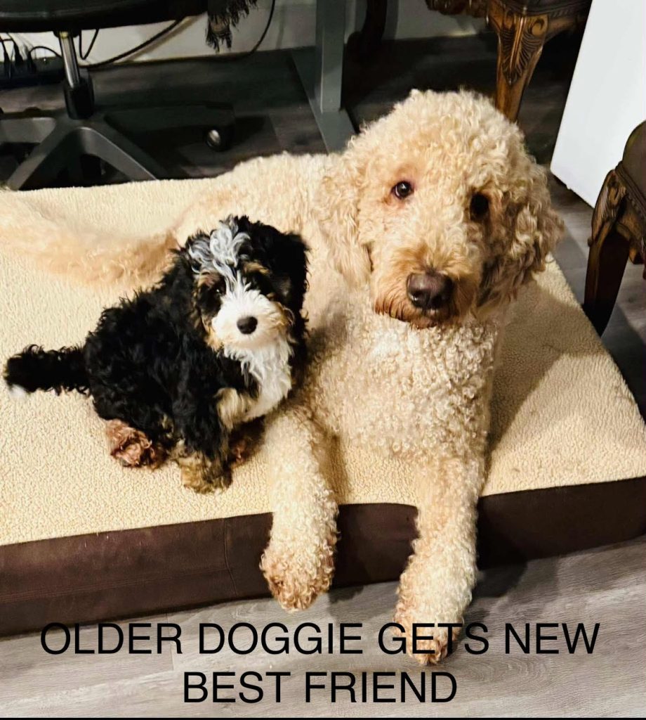 MAISY- Maisy beautiful is a Bernedoodle with a silly side. She weighs 48 pounds. She makes us belly laugh with her goofy smile she will do when asked for! She is also a Velcro dog which makes her such a good companion. When I sit to watch a movie I always end up with both Jackie and Maisy on my lap or right up against me. Maisy also will snuggle all night in my bed which helps me sleep better. Maisy’s hobby is playing nurse. Anyone has an issue and Maisy has her nose pressed right into it with a look of great concern! She also enjoys boating and sunning herself on the big family deck in the forest watching for birds, squirrels and deer! She is a sweetheart but wants to be top on your LOVE LIST as in wants all the attention to herself. She loves to mother anything and anyone! Her hair is Gorgeous! She is genetic tested their babies will be genetically strong on health and will have the much sought after tri color Bernedoodle look. Pups will be medium weighing between 35-45 pounds
